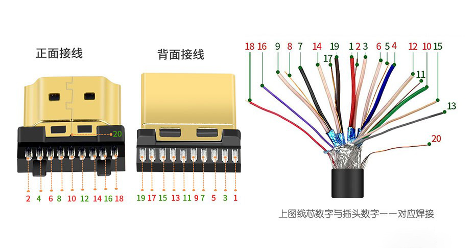 HDMI A type接口定義以及各個引腳的作用到這里就講解完了,HDMI公頭焊接的時候一定要對照好線序與引腳哦,不然焊接完成也是不能正常使用的。