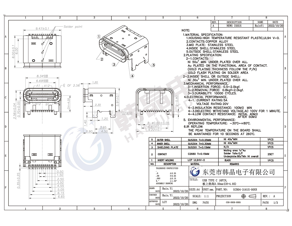 絕緣體材料: LCP,UL94V-0;COL0R;BLACK