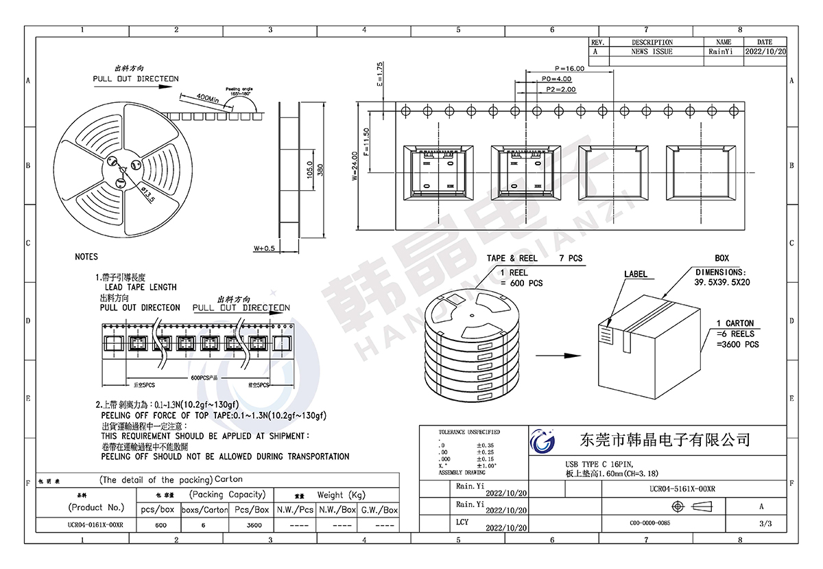 • TYPE-C 16PIN L-8.0mm板上墊高型1.6mm CH=3.18 型號:UCR04-5161X-00XR