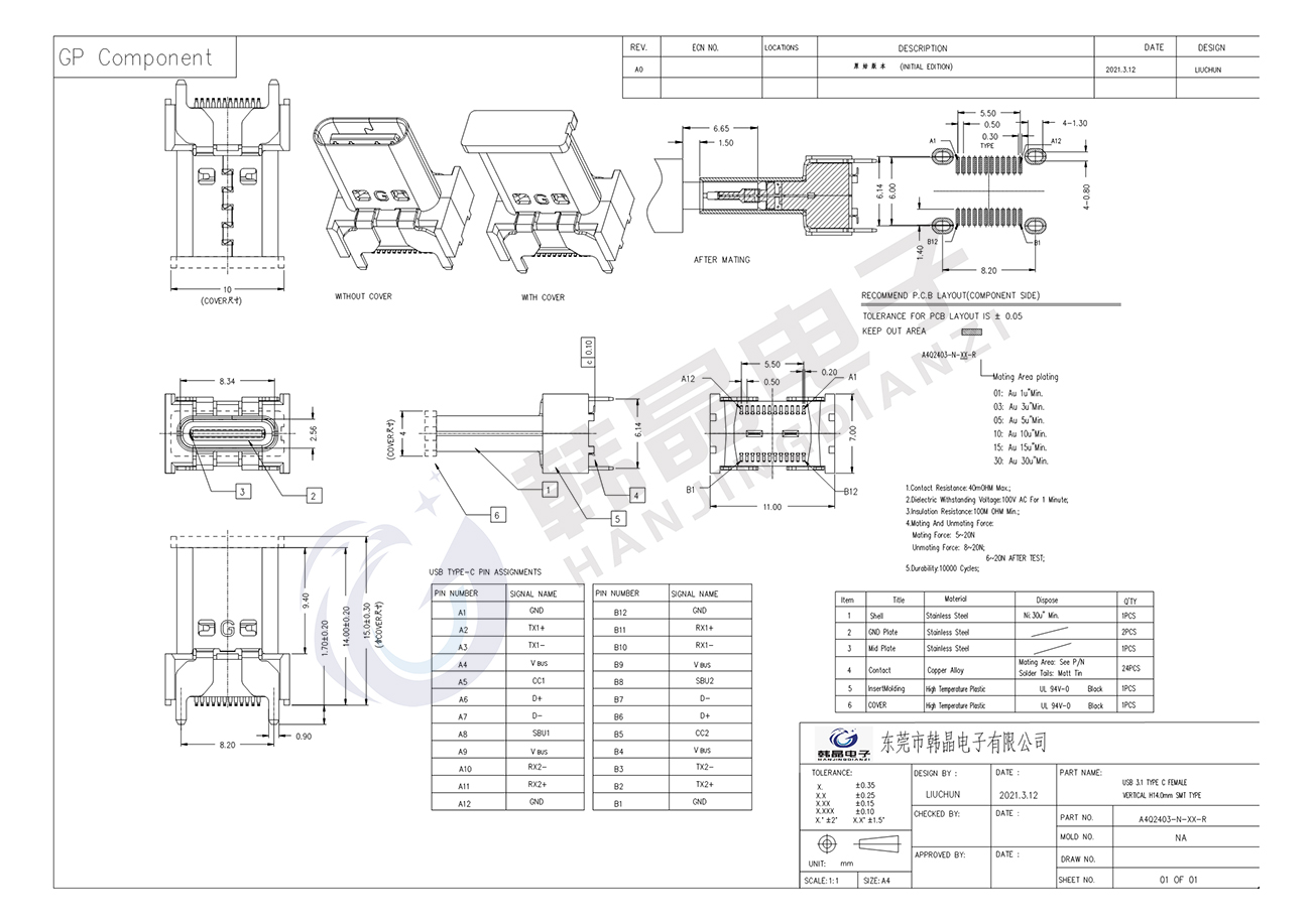絕緣體材料: PA9T, ul94 v-0
