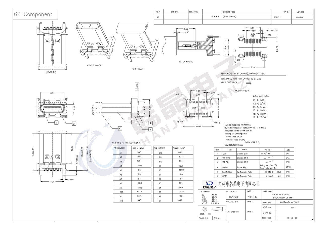 絕緣體材料: PA9T, ul94 v-0