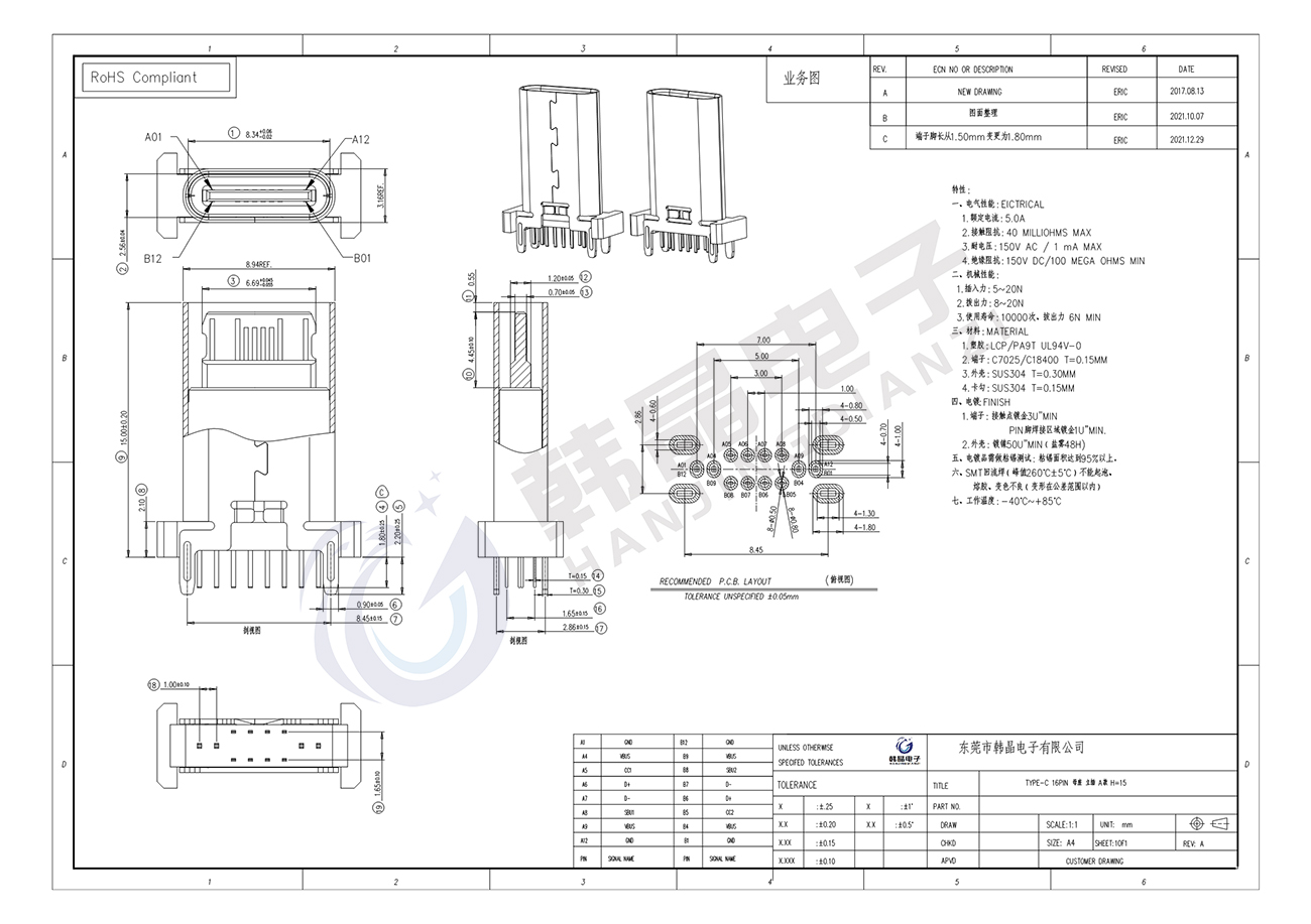 絕緣體材料: LCP, PA9T UL94 v-0